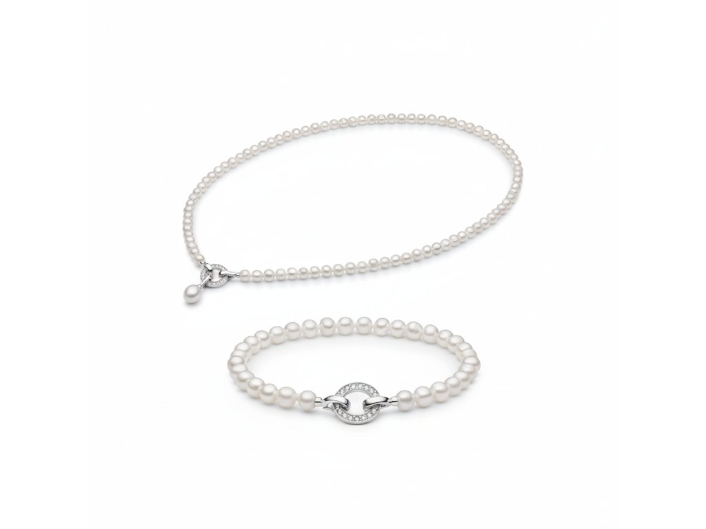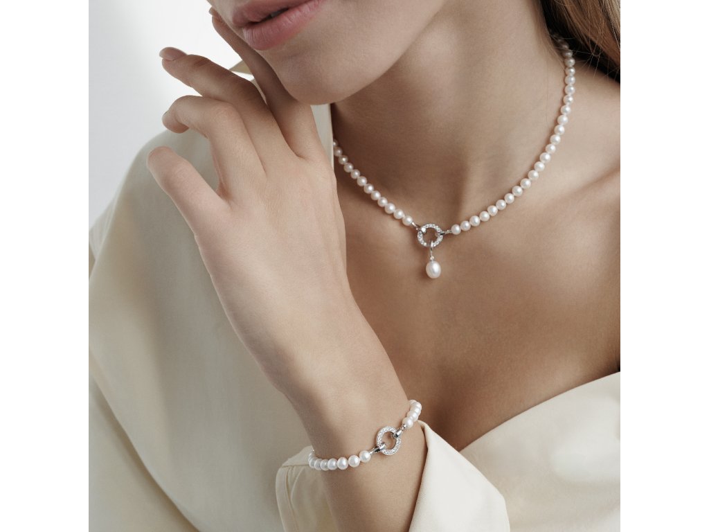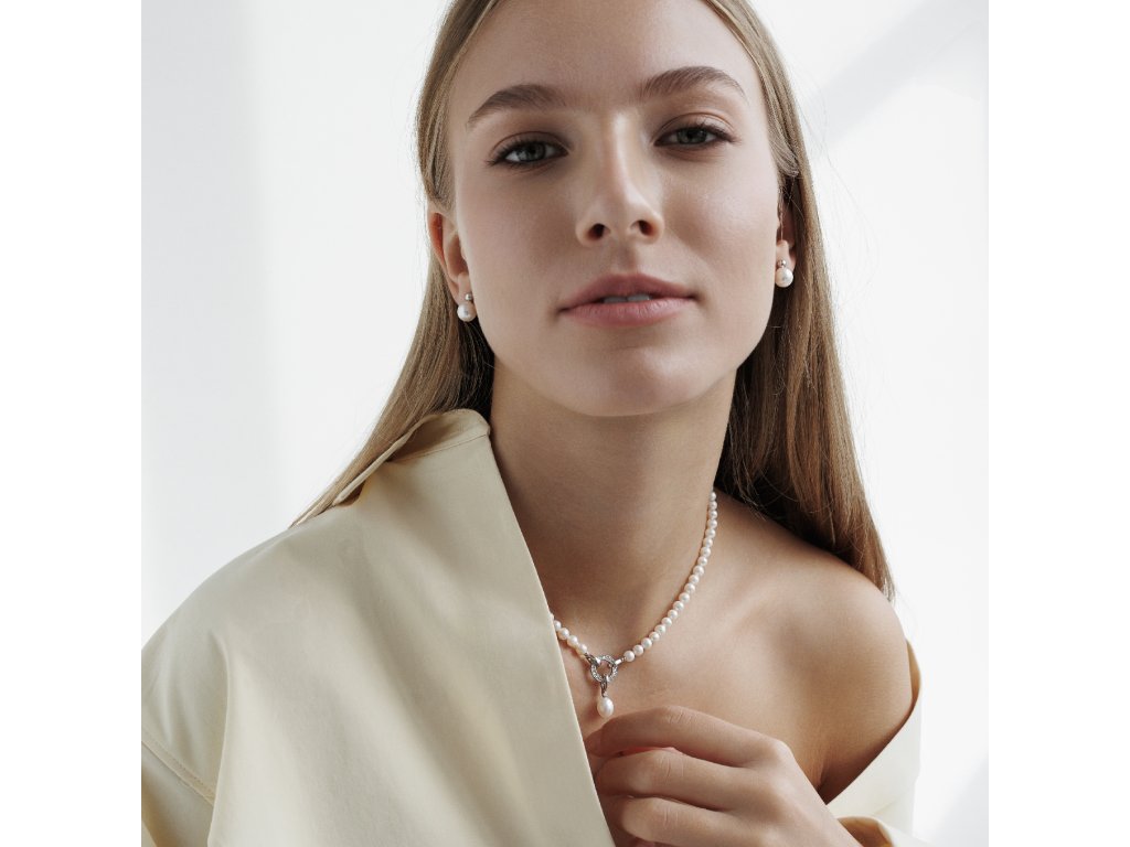 Jedním z klíčových prvků tohoto šperku je zdobné zapínání na karabinu se zirkony. Zirkony přidávají jemný třpyt, který kontrastuje s čistotou bílých perel a dodává celému šperku luxusní a sofistikovaný vzhled. Toto zapínání není jen praktické, ale také esteticky přitažlivé, což z něj činí důležitou součást designu.