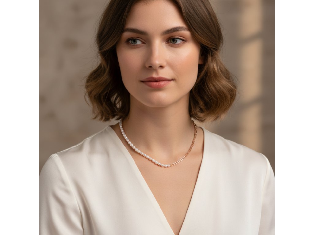 Tento dámský náhrdelník z pravých bílých rice perel je elegantním šperkem, který dokonale kombinuje klasickou krásu s moderním stylem. Rice perly, pojmenované podle svého podlouhlého tvaru připomínajícího zrnka rýže, jsou ceněné pro svůj jemný lesk a schopnost dodat šperku jemnost a sofistikovanost. Ověřený a certifikovaný původ perel zaručuje vysokou kvalitu a pravost.