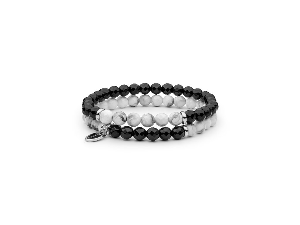 Howlit, na druhé straně, je kámen klidu a harmonie. Je známý svou jemnou bílou barvou s šedými žilkami, které vytvářejí zajímavý a uklidňující vzhled. Howlit je často spojován s klidem a meditací, pomáhá nositeli uvolnit se a nalézt vnitřní rovnováhu. V kombinaci s onyxem přináší do setu kontrast a harmonii, což z něj činí nejen vizuálně atraktivní, ale také emocionálně vyvážený doplněk.