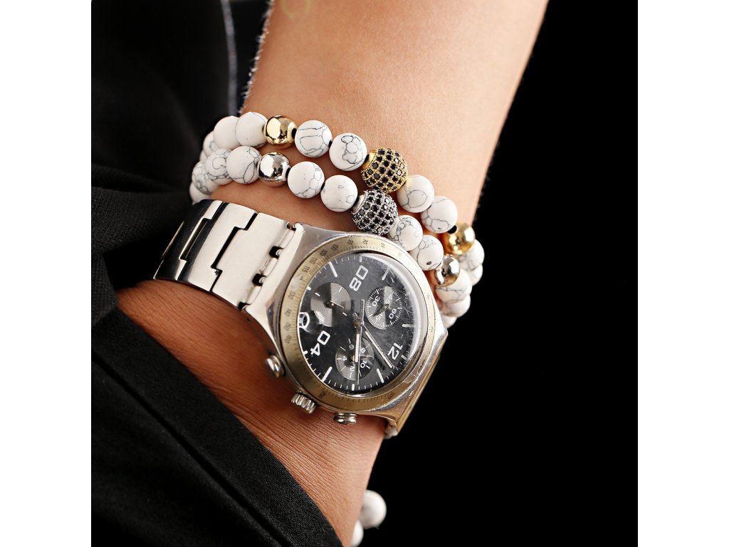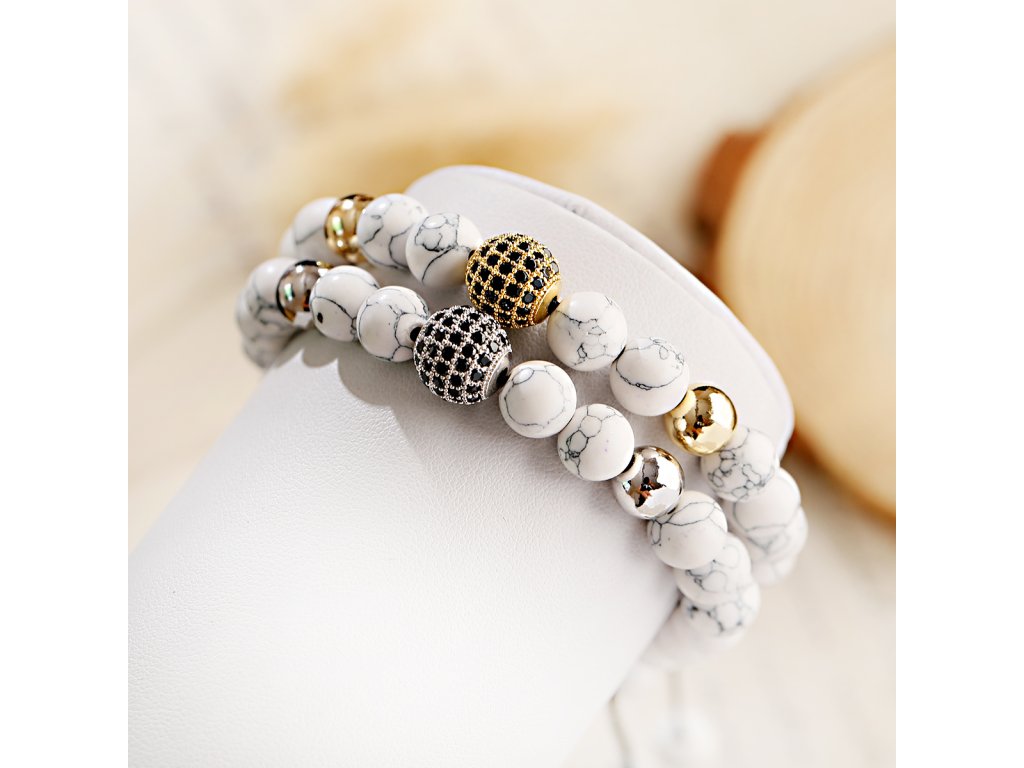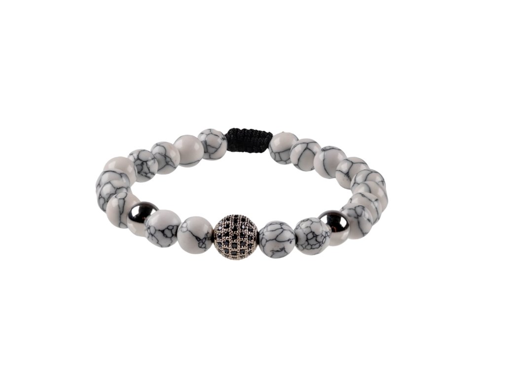 Atraktivní unisex náramek z kuliček magnezitu s moderními prvky v barvě stříbra
