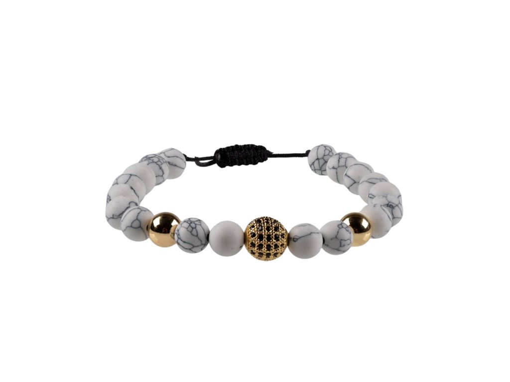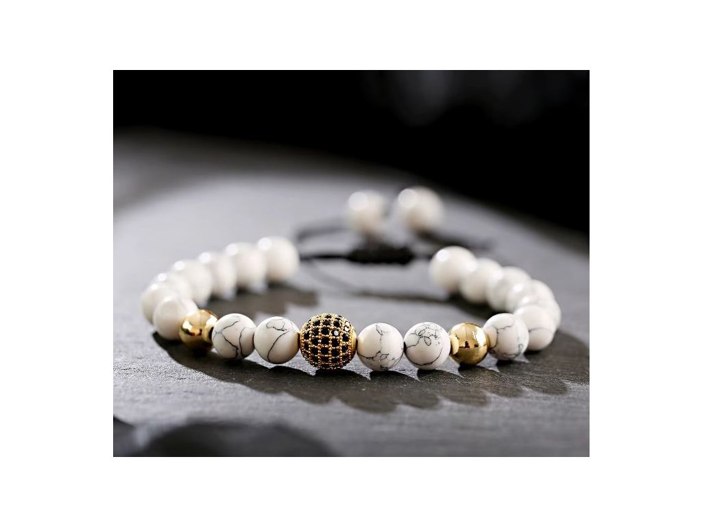Atraktivní unisex náramek z kuliček magnezitu s moderními prvky v barvě zlata