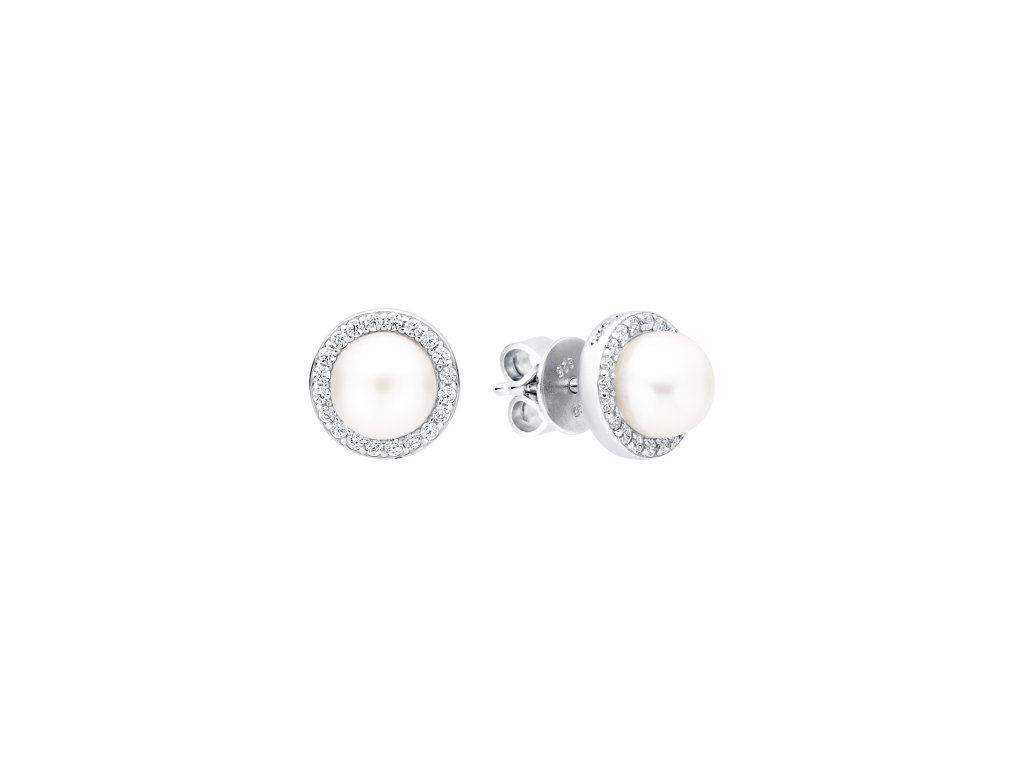 Dámské elegantní náušnice pecky z rhodiovaného stříbra s bílými perlami a zirkony
