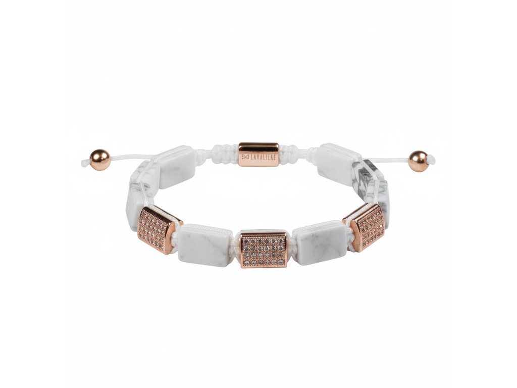 Náramek je prokládán stříbrnými destičkami s růžovým pozlacením, které dodávají šperku luxusní a sofistikovaný vzhled. Zirkony osázené na stříbrných destičkách přidávají jemný třpyt, který přitahuje pozornost a zvyšuje estetickou hodnotu šperku.