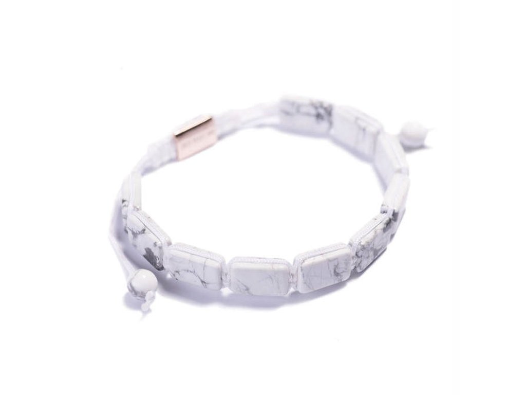 Originální dámský náramek shamballa z vybroušených destiček Howlitu je ručně vyráběný s variabilní délkou. Kvalitní voskované lanko zdobí brand z růžového pozlaceného stříbra. Tento elegantní dámský náramek je dokonalým šperkem pro každodenní nošení do práce nebo na párty, kde podtrhne Váš outfit.Doplňkové parametry