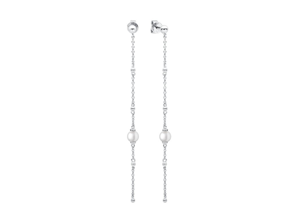 Dlouhé stříbrné řetízkové visací náušnice s pravou bílou perlou a zdobnými prvky