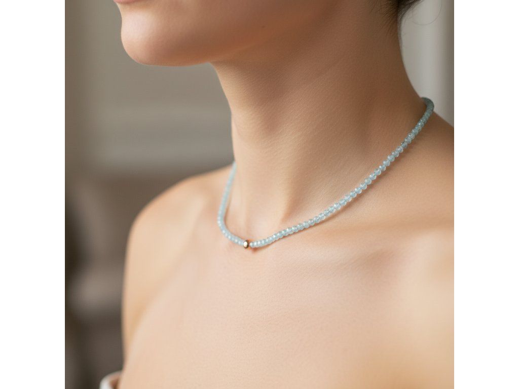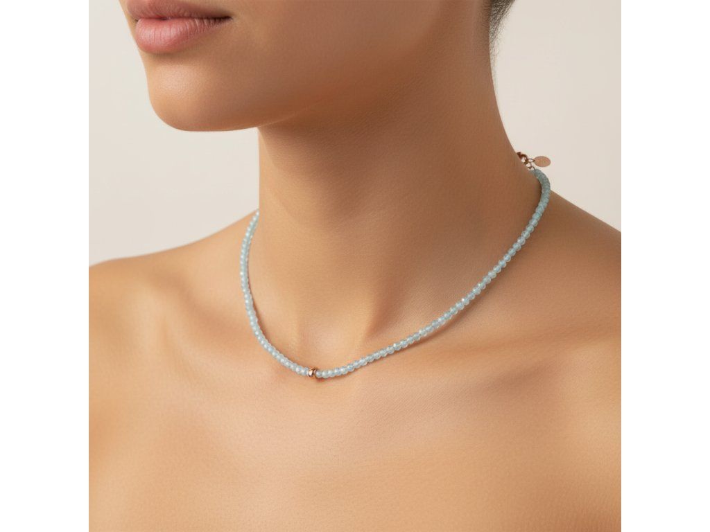Uvedený akvamarínový náhrdelník představuje dokonalý příklad spojení přírodního kouzla a moderního designu, které společně vytvářejí něco opravdu výjimečného. Akvamarínové kuličky, pečlivě vybroušené do jemných tvarů o velikosti 4-4,5 mm, nejenže odrážejí světlo s jemným leskem, ale také dodávají každému outfitu dotek klidné elegance a vznešenosti.
