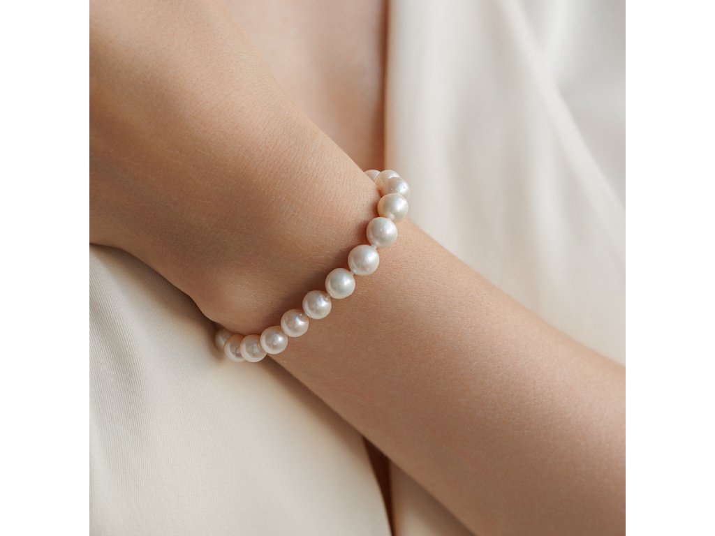Elegantní náramek z certifikovaných luxusních bílých perel představuje perfektní spojení tradiční krásy perel a moderních designových prvků. Bílé perly o velikosti 7 - 8 mm jsou pečlivě vybírány pro svůj lesk a tvar, což zajišťuje, že náramek působí harmonicky a vyváženě. Certifikace zaručuje, že každá perla splňuje vysoké standardy kvality, což přidává na hodnotě a prestiži tohoto šperku.