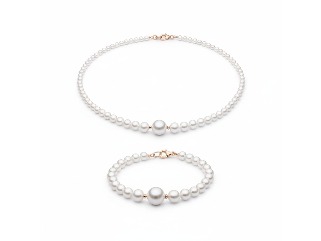 Luxusní a velmi elegantní náramek z rhodiovaného stříbra s 14kt růžovým pozlacením je skutečným skvostem mezi šperky. Jeho ozdobou jsou pravé bílé perly v odstupňovaných velikostech od 6 do 14 mm, které vytvářejí harmonický a esteticky vyvážený celek. Dominantní velká a luxusní Edison perla uprostřed dodává šperku jedinečný vzhled a sofistikovaný lesk, čímž přitahuje pozornost a podtrhuje eleganci náramku.