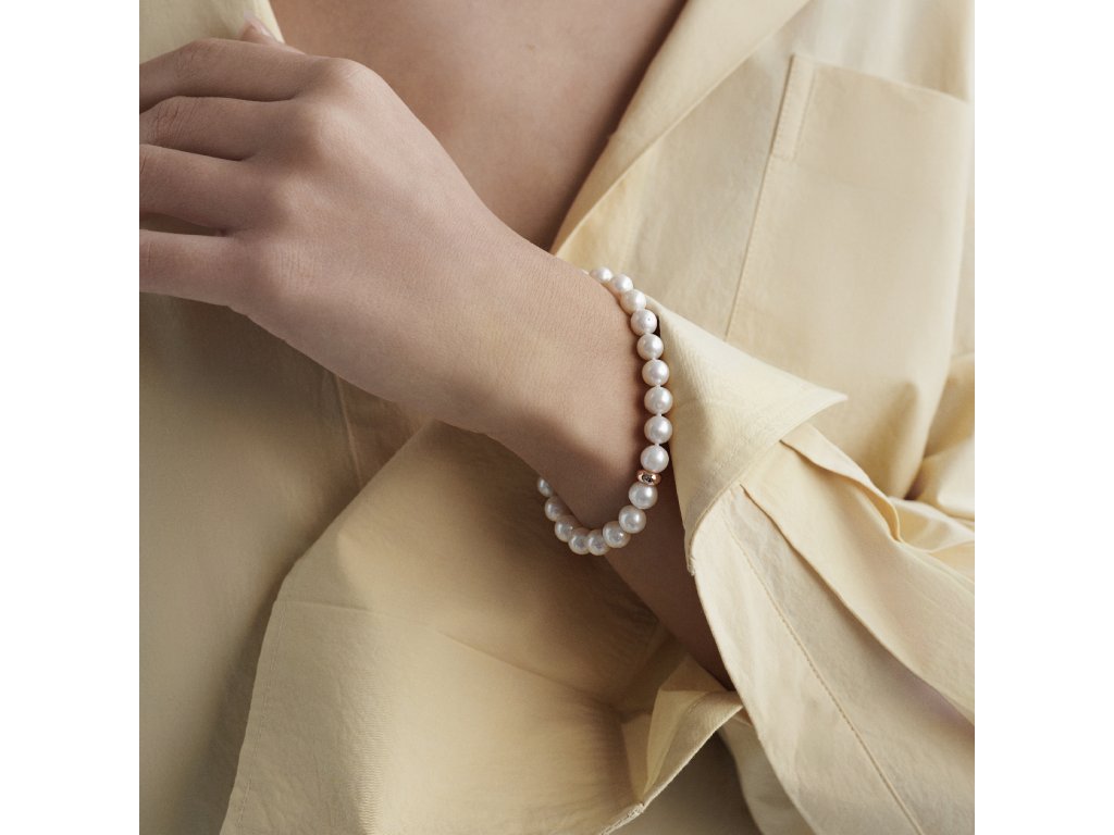 Elegantní perlový náramek s růžově pozlaceným korálkem a karabinkovým zapínáním