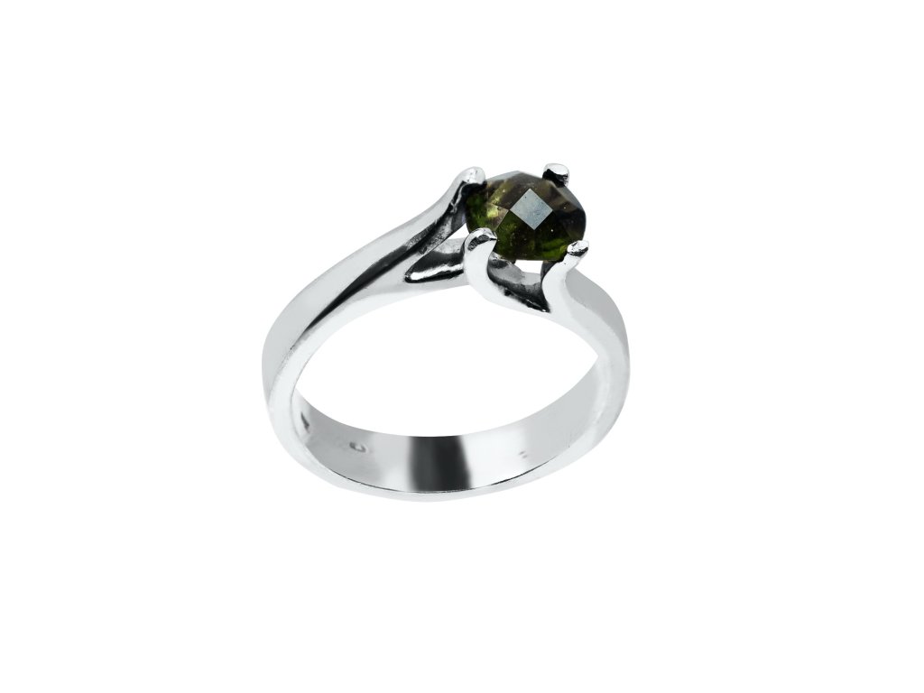 Originální dámský prsten z rhodiovaného stříbra s precizně šachovnicovým výbrusem. Dominantní stříbrná obroučka prstenu, která je zakončena originálním designem korunky, kde je usazen vltavín v briliantovém brusu. Celková hmotnost prstenu je 3,628g je příkladnou šperkařskou prací za malé dílny. Ke každému šperku dostanete podepsaný certifikát pravosti kamene.