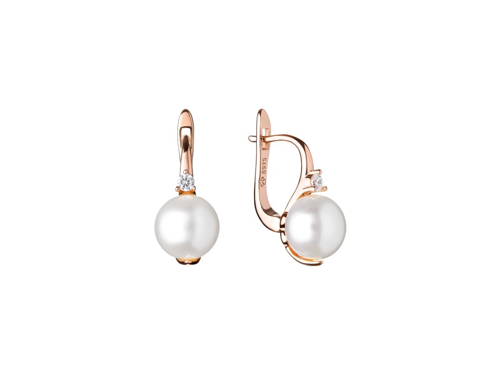 Luxusní dámské visací náušnice z růžově pozlaceného rhodiovaného stříbra s bílou sladkovodní perlou