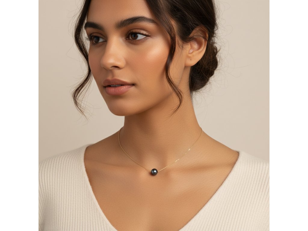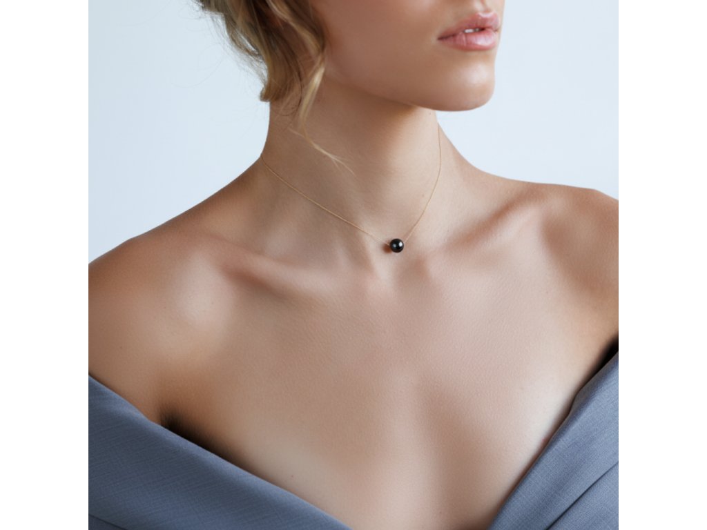 Středem tohoto nádherného náhrdelníku je pravá černá perla o velikosti 8-9 mm. Perla vyniká nejen svou bezchybnou strukturou, ale především svým tajemným a hlubokým leskem, který přitahuje pozornost a dodává nositelce auru elegance a výjimečnosti.