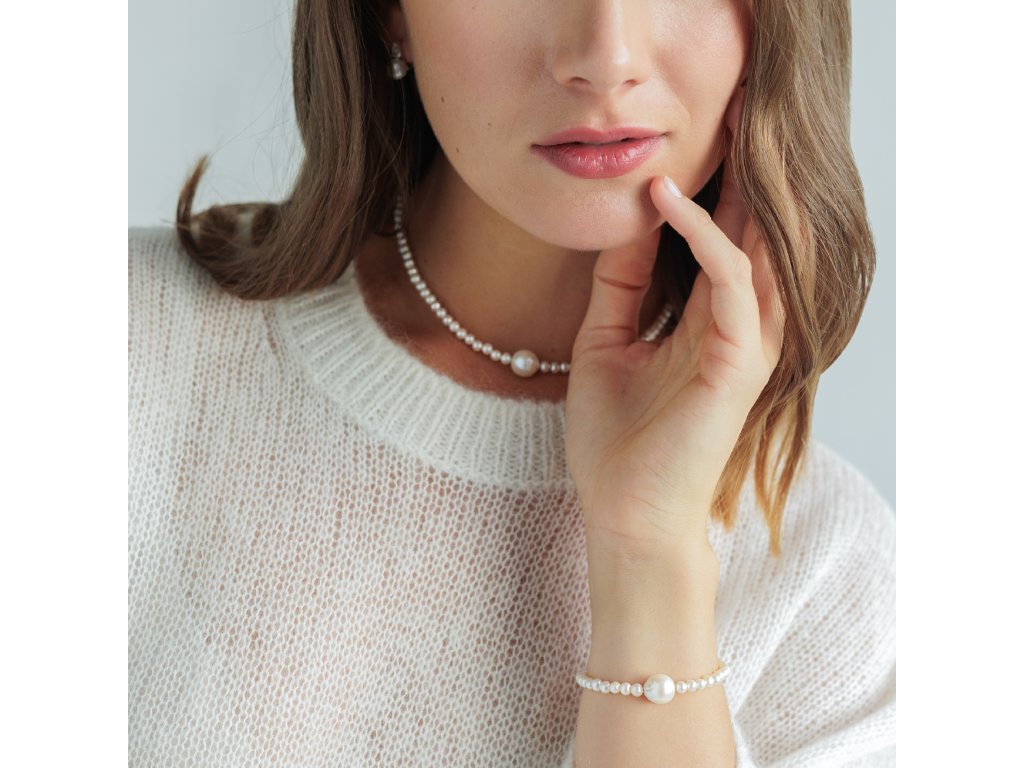 Luxusní náramek z bílých Kasumi perel s dominantní pravou perlou je elegantním a sofistikovaným šperkem. Kasumi perly, známé svou vysokou kvalitou a jemným leskem, dodávají náramku nadčasový vzhled. Dominantní pravá perla uprostřed náramku přitahuje pozornost a dodává šperku výrazný prvek. Stříbrné variabilní zapínání na karabinu umožňuje snadné přizpůsobení délky, což zajišťuje pohodlné nošení. Tento náramek je ideální pro ženy, které chtějí vyjádřit svou eleganci a vytříbený styl prostřednictvím luxusního doplňku, a hodí se pro každodenní nošení i speciální příležitosti.