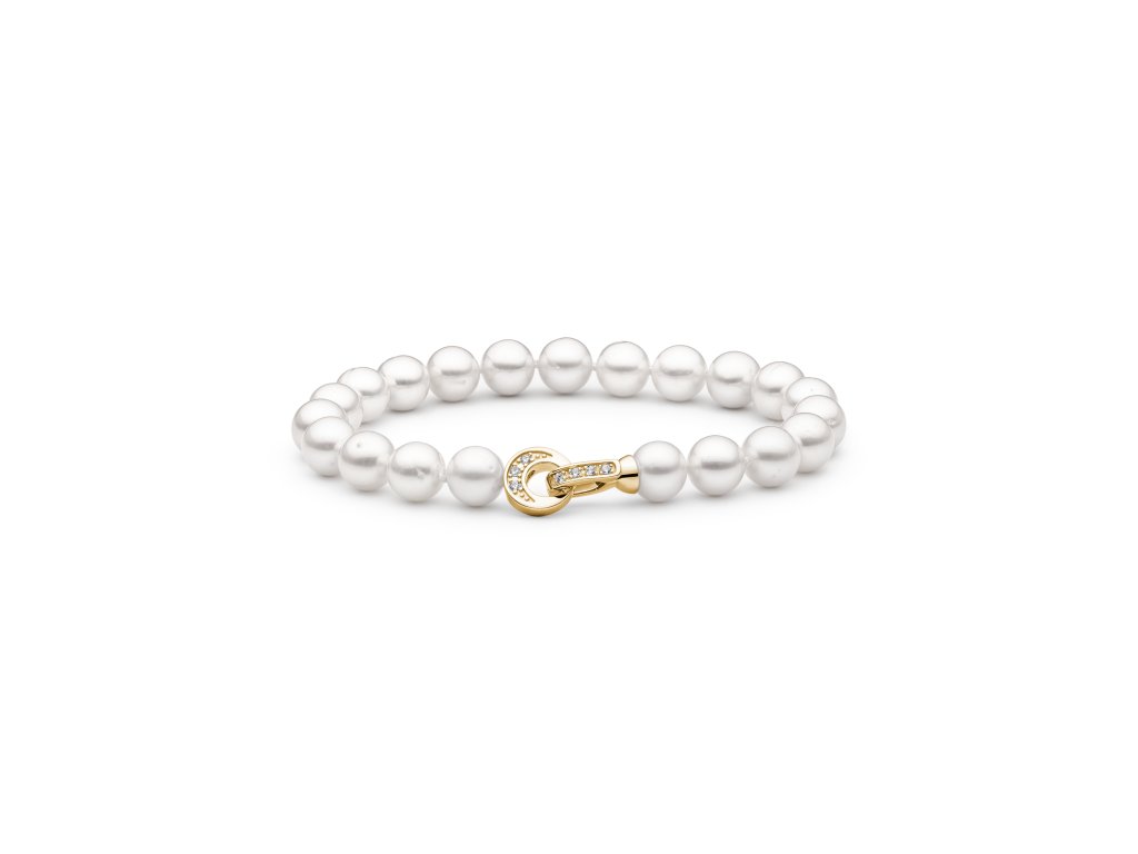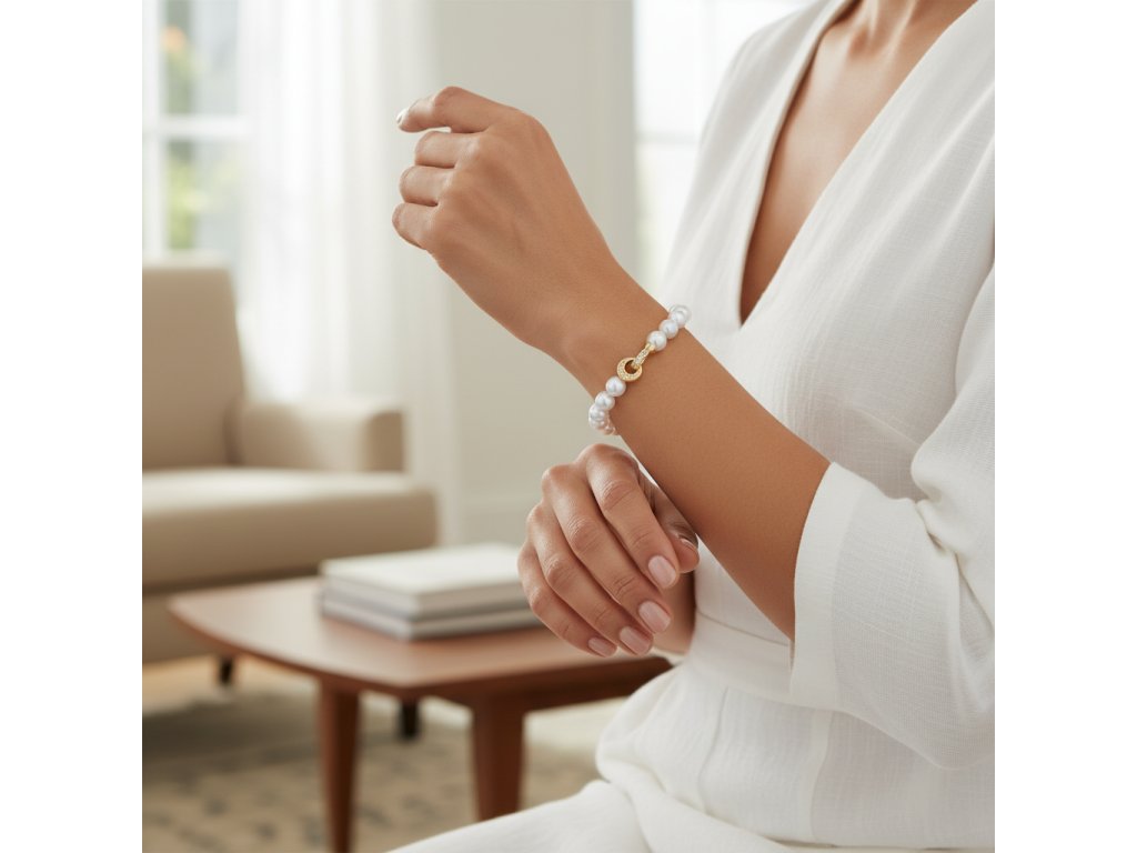 Luxusní náramek z bílých perel s dekorativním pozlaceným zapínání na karabinu se zirkony
