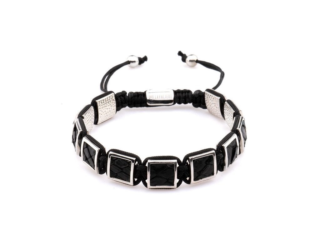 Moderní design luxusního pánského shamballa náramku z oceli a imitace rejnočí kůže, který je ručně vázaný. Dokonalá kombinace barev destiček dodává pánskému náramku luxus. Variabilní délka náramku s macrame vázáním zdobí pozlacené kuličky a brand.