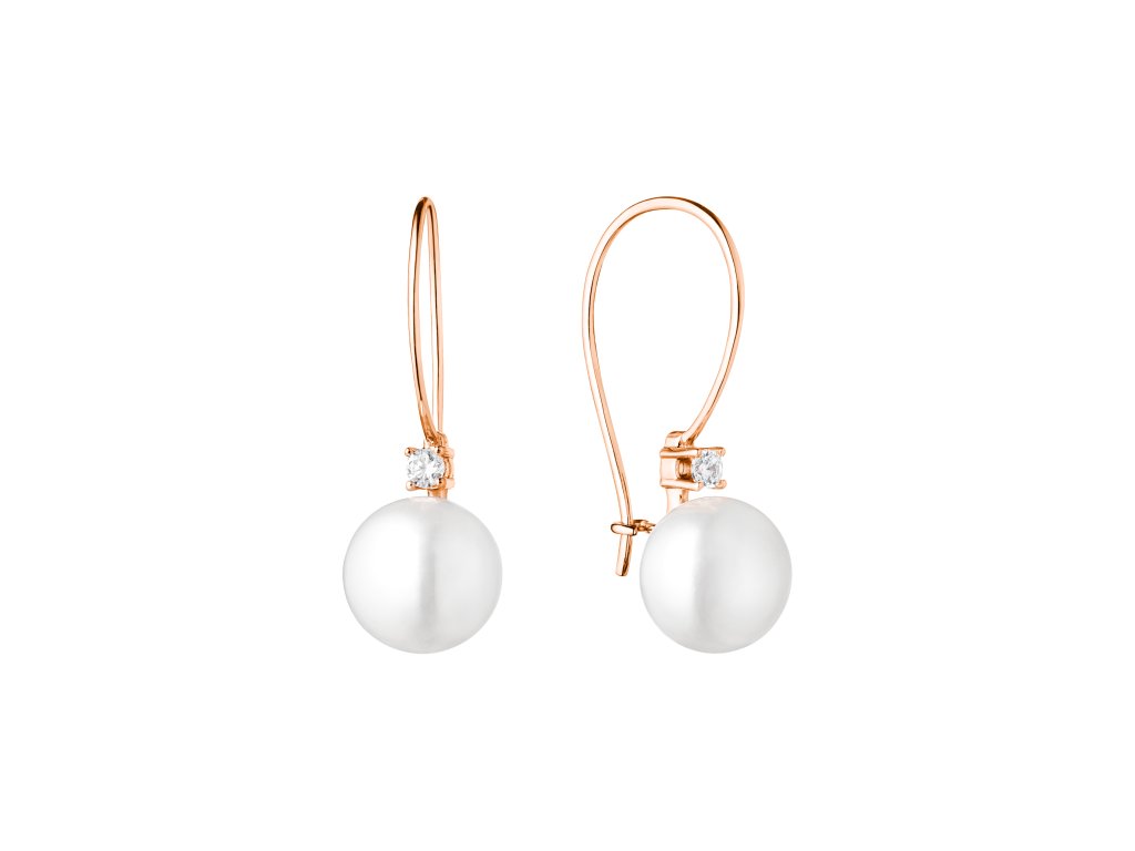 Luxusní visací náušnice z růžového zlata s bílou sladkovodní perlou a třpytivými zirkony