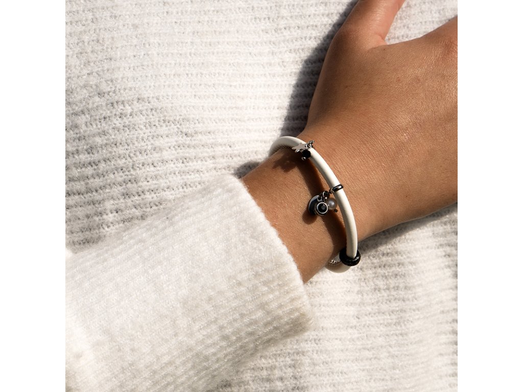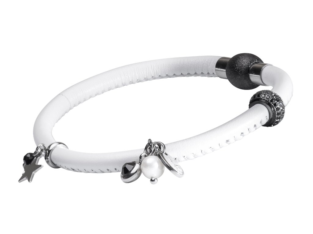 Moderní bílý kožený náramek ztělesňuje čistou eleganci spojenou s rafinovanými detaily. V centru designu se skví autentická bílá sladkovodní perla, symbol čistoty a sofistikovanosti. Náramek oživuje ozdobný kroužek osázený třpytivými perleťovými zirkony, doplněný hravými přívěsky a lesklými ocelovými prvky. Tato kombinace vytváří poutavý kontrast s jemnou bílou kůží. Praktické magnetické zapínání z chirurgické oceli zaručuje snadné nasazení a bezpečné nošení. S váhou pouhých 10,5g je náramek lehký a pohodlný, ideální pro každodenní použití. Tento bílý kožený náramek s perlou představuje dokonalou volbu pro moderní ženy, které ocení nadčasový design s nádechem luxusu. Ať už ho zvolíte jako solitér nebo v kombinaci s dalšími šperky, tento kousek nepochybně upoutá pozornost a podtrhne váš osobitý styl.