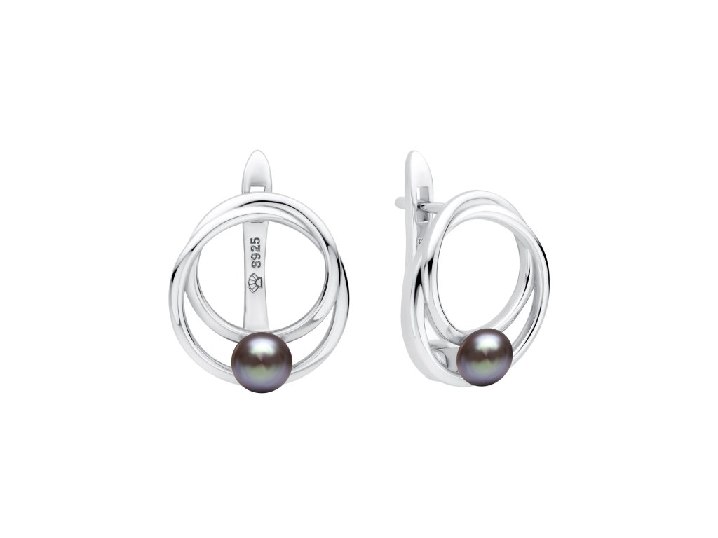 Moderní dámské náušnice z rhodiovaného stříbra s pravou černou sladkovodní perlou