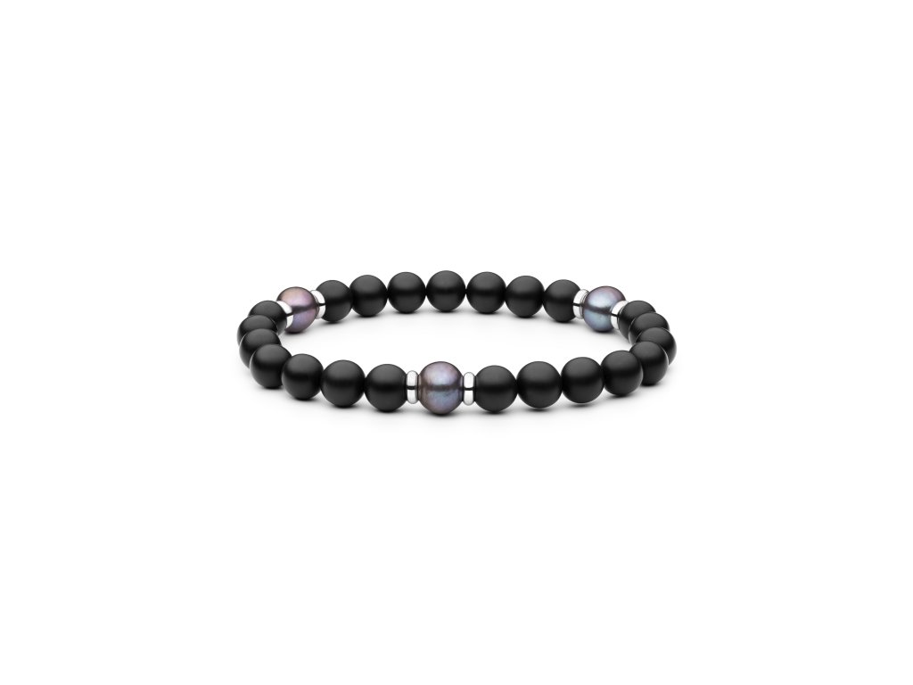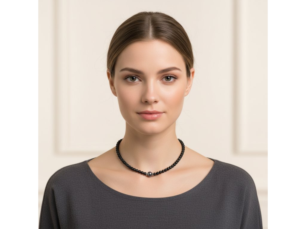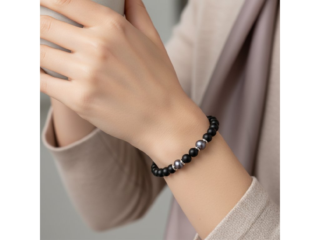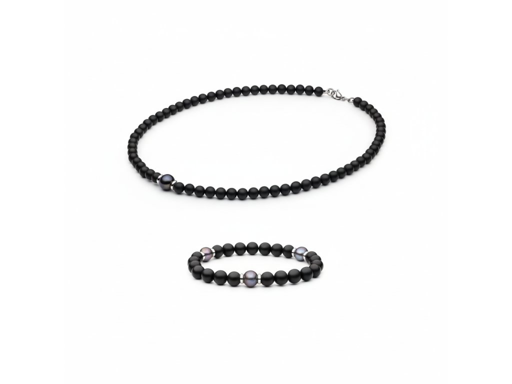 Moderní onyxový set šperků s pravou černou perlou a stříbrnými prvky představuje dokonalé spojení elegance a moderního designu. Onyxové kuličky o velikosti 6-6,5 mm dodávají šperkům klasický a nadčasový vzhled, zatímco pravé šedé multicolor perly přinášejí jemný barevný akcent, který je jak elegantní, tak i trendy.