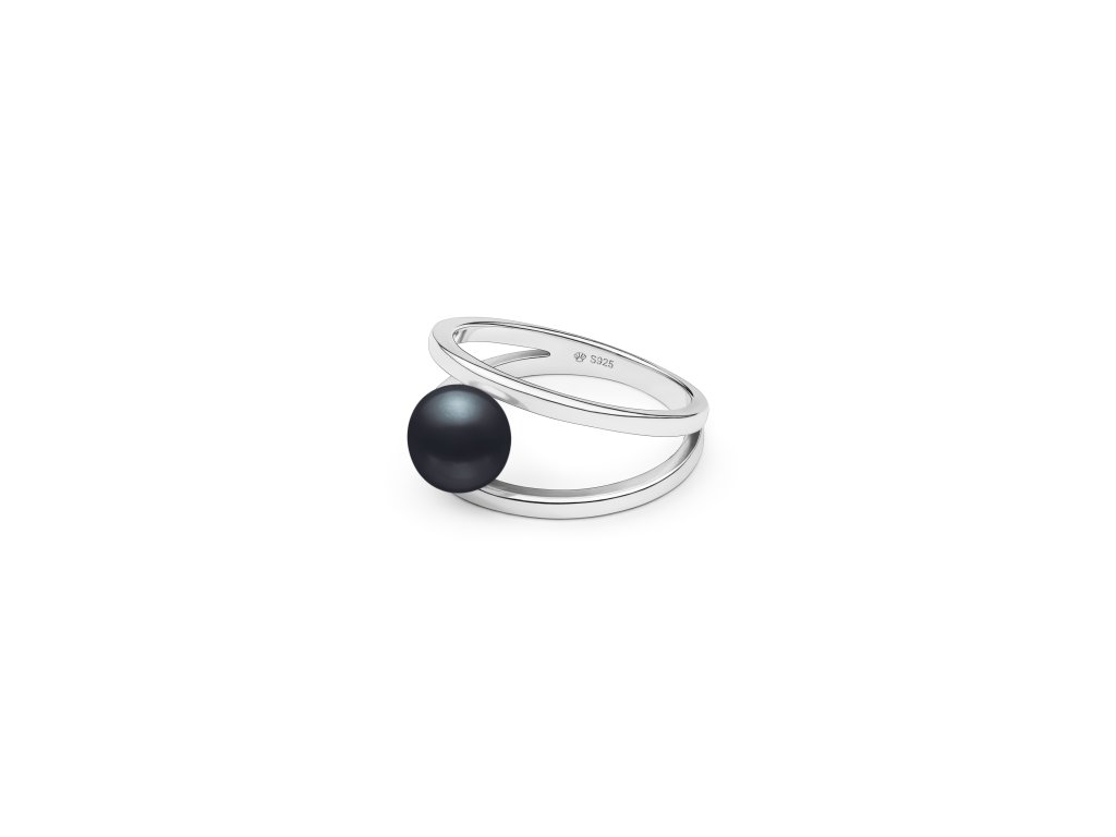Moderní stříbrný dvouřadý prsten s pravou černou perlou