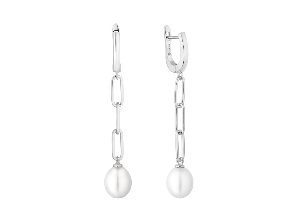 Módní stříbrné dlouhé visací náušnice s atraktivním řetízkem s oky zakončené pravou bílou perlou