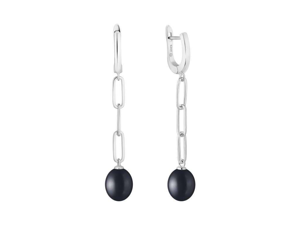 Módní stříbrné dlouhé visací náušnice s atraktivním řetízkem s oky zakončené pravou černou perlou