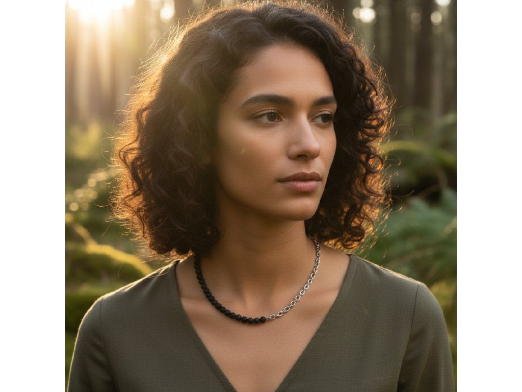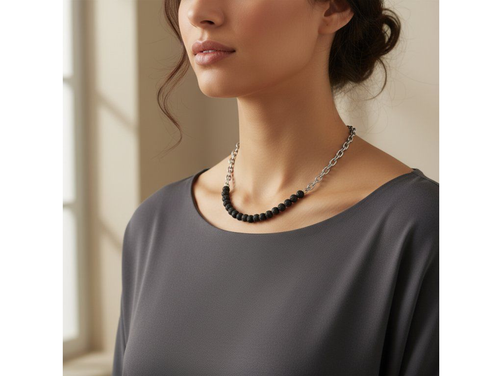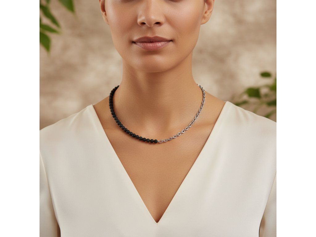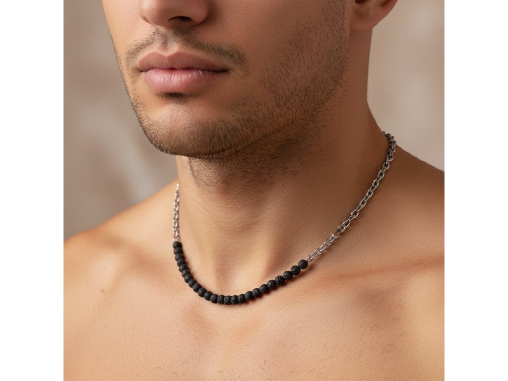 Ocelový řetízek je navržen tak, aby vyhovoval vysokým standardům odolnosti a stylu. Jeho jemný lesk hladce navazuje na drsnou krásu lávových kuliček, čímž vzniká harmonická rovnováha mezi různorodými povrchy. Tento sofistikovaný šperk jistě zaujme pozornost při jakékoli příležitosti, ať už jde o důležitou pracovní schůzku, nebo večírek s přáteli.