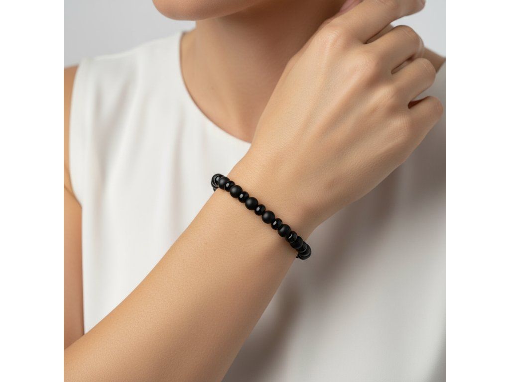 Náramek z matného a lesklého onyxu představuje dokonalou harmonii stylu a praktickosti. Kombinace matných a lesklých kuliček onyxu vytváří nejen výrazný vizuální efekt, ale také symbolizuje rovnováhu mezi tradiční elegancí a moderní módou. Matné kuličky přidávají dojem hloubky a klidu, zatímco menší lesklé prvky přinášejí do vašeho vzhledu dynamiku a jiskru.