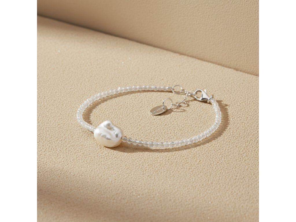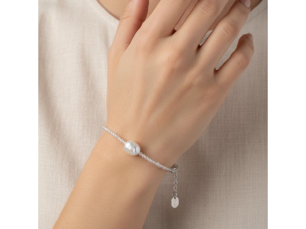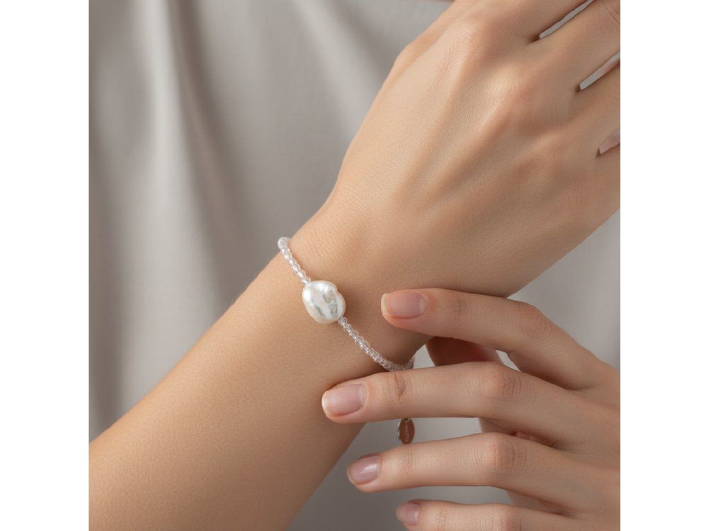 Náramek z opálu s pravou bílou barokní perlou je skutečným klenotem mezi šperky, který si najde místo v každé šperkovnici. Jemné opálové kuličky o velikosti 2-3 mm jsou pečlivě vybroušené, aby zachytily světlo a zářily v každém úhlu, přičemž přinášejí harmonickou hru jemných odstínů. Opál je kámen známý svou úchvatnou schopností měnit barvy, což náramku přidává na zvláštnosti a přitažlivosti.