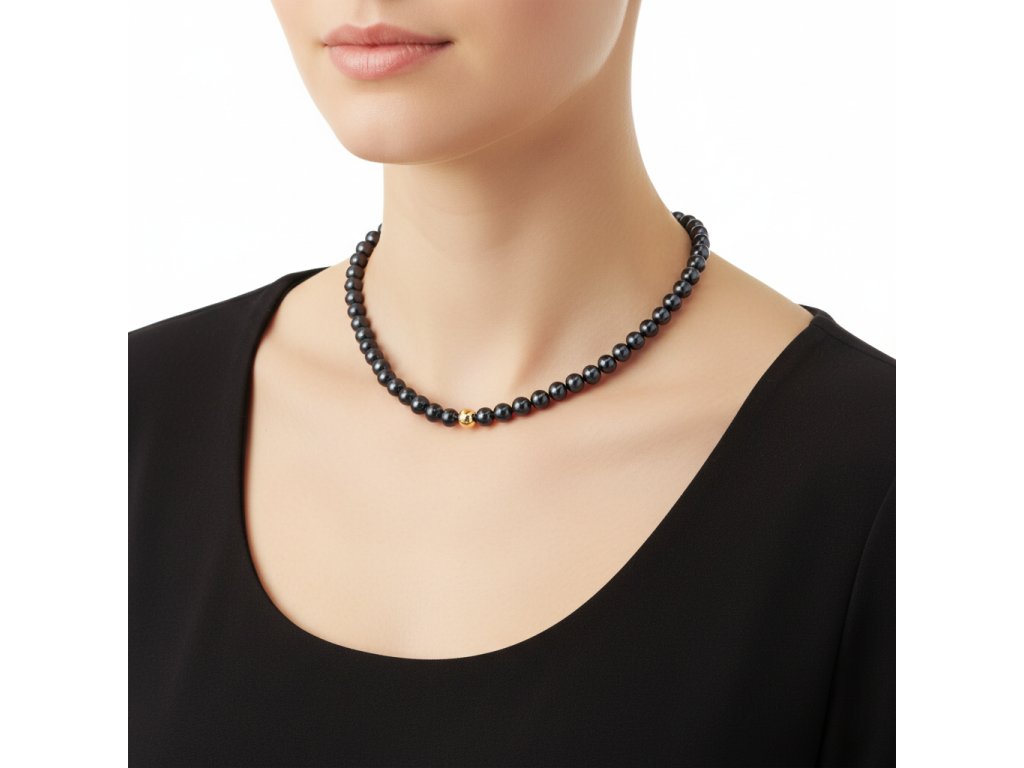 Tento noblesní náhrdelník z černých sladkovodních perel je skutečným ztělesněním elegance a luxusu, který v sobě spojuje přírodní krásu s mistrovským řemeslným zpracováním. Černé sladkovodní perly, které tvoří základ tohoto šperku, jsou vysoce ceněné pro svou vzácnost a unikátní barvu. Každá perla o velikosti 9 - 10 mm je pečlivě vybírána, aby splňovala nejvyšší standardy kvality a lesku. Tyto perly jsou charakteristické svou hlubokou, sytou černou barvou, která je často doprovázena jemnými odstíny zelené, modré nebo fialové, což dodává šperku dynamiku a hloubku.