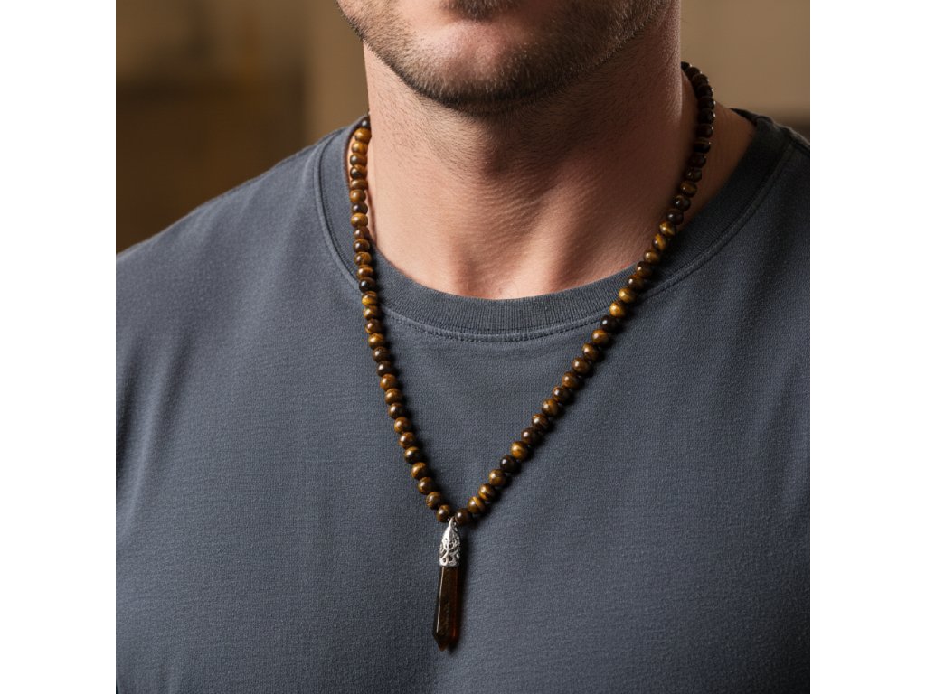 Moderní pánský náhrdelník z broušených korálků z tygřího oka je stylovým šperkem, který kombinuje přírodní krásu a moderní eleganci. Tygří oko je známé pro svou schopnost přinášet odvahu a sebedůvěru, a jeho charakteristický lesk a barva dodávají náhrdelníku atraktivní a dynamický vzhled.