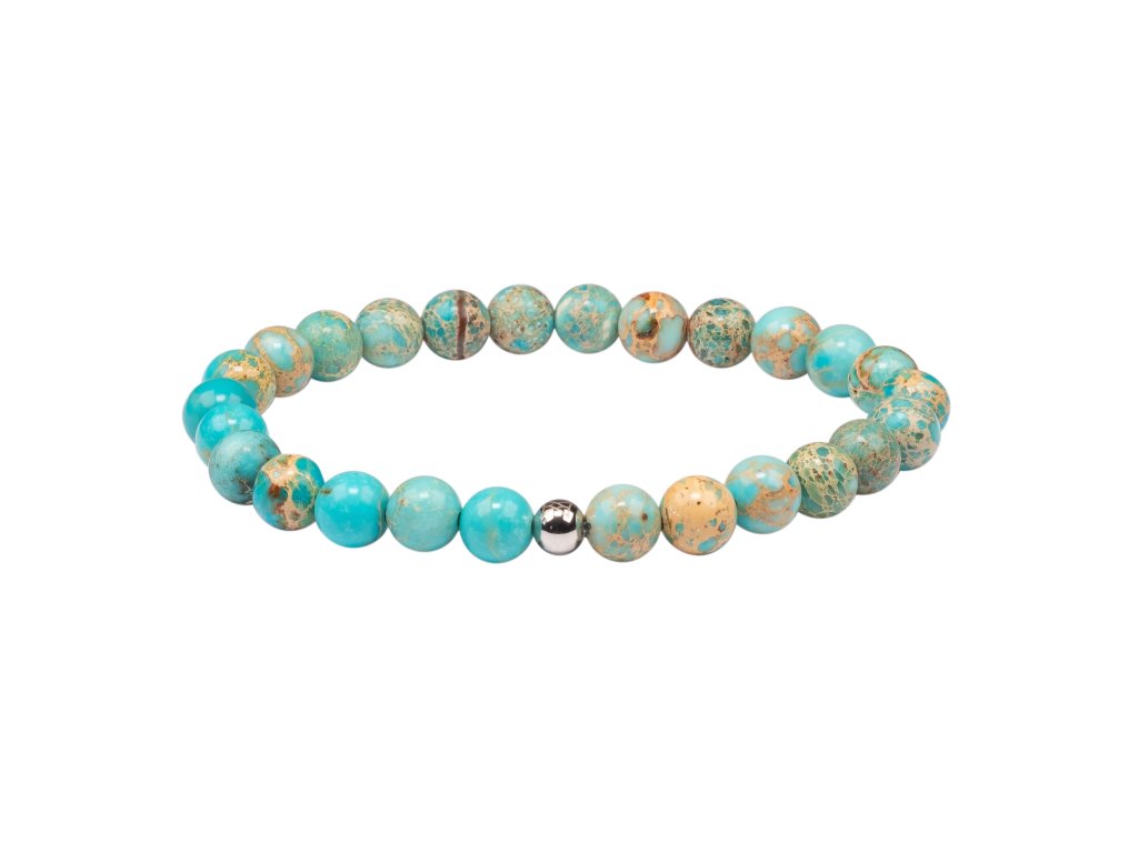 Pánský náramek z broušených kuliček mořského sedimentu o velikosti 10mm zdobený hladkou kuličkou z rhodiovaného stříbra. Kvalitní elastické šperkařské vlákno se pohodlně přizpůsobí pánskému zápěstí. Krásná kombinace barev podtrhuje krásu pánského šperku, který skvěle doplní outfit.