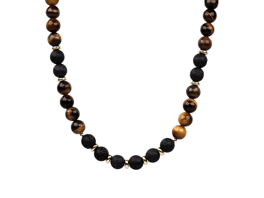Atraktivní pánský náhrdelník z broušených kuliček tygřího oka a černého achátu o velikosti 8 mm je elegantním a stylovým doplňkem pro moderního muže. Tento náhrdelník je prokládaný korálky z kvalitní ocele pozlacené 18kt zlatem, což mu dodává sofistikovaný vzhled. Náhrdelník má délku 50 cm a je vybaven karabinkovým zapínáním pro snadné a bezpečné nošení. Tento krásný náhrdelník v moderním designu si zamiluje každý muž, který chce vyjádřit svůj osobitý styl a eleganci.