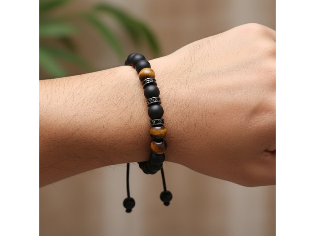 Pánský shamballa náramek v moderním trendy designu představuje dokonalou kombinaci elegance a síly. Achát, známý pro své ochranné vlastnosti, je broušen do jemných korálků, které dodávají náramku rafinovaný vzhled. Tygří oko, s jeho charakteristickými zlatavými a hnědými tóny, je kámen známý svou schopností přinášet vnitřní sílu a odvahu. Společně tyto kameny tvoří harmonický celek, který nejenže vypadá skvěle, ale také nabízí duchovní podporu.