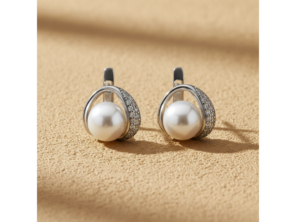 Stříbrné náušnice s bílou sladkovodní perlou a zirkony