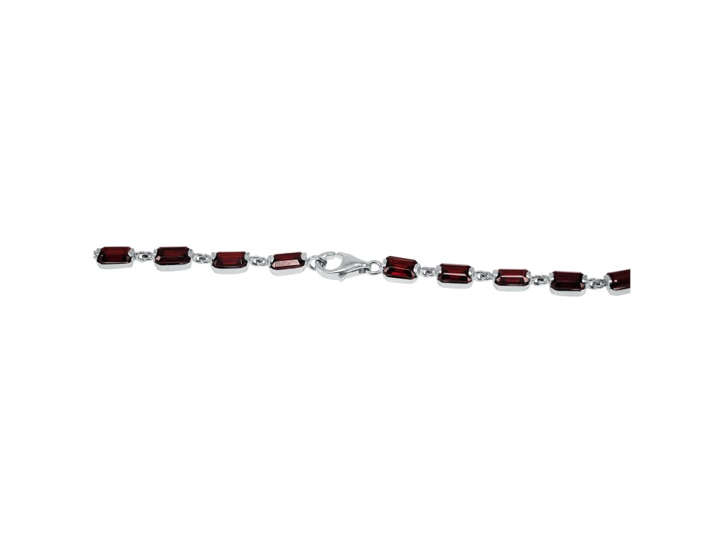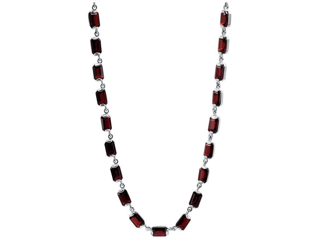 Stříbrný náhrdelník s granátem v bagetovém výbrusu, kde každý granát je ručně osázen ve stříbře. 43ks granátu tvoří délku náhrdelníku a má karabinkové zapínání. Celková hmotnost je 18,9g. Noblesní náhrdelník, který podtrhne šarm a eleganci každé ženy.