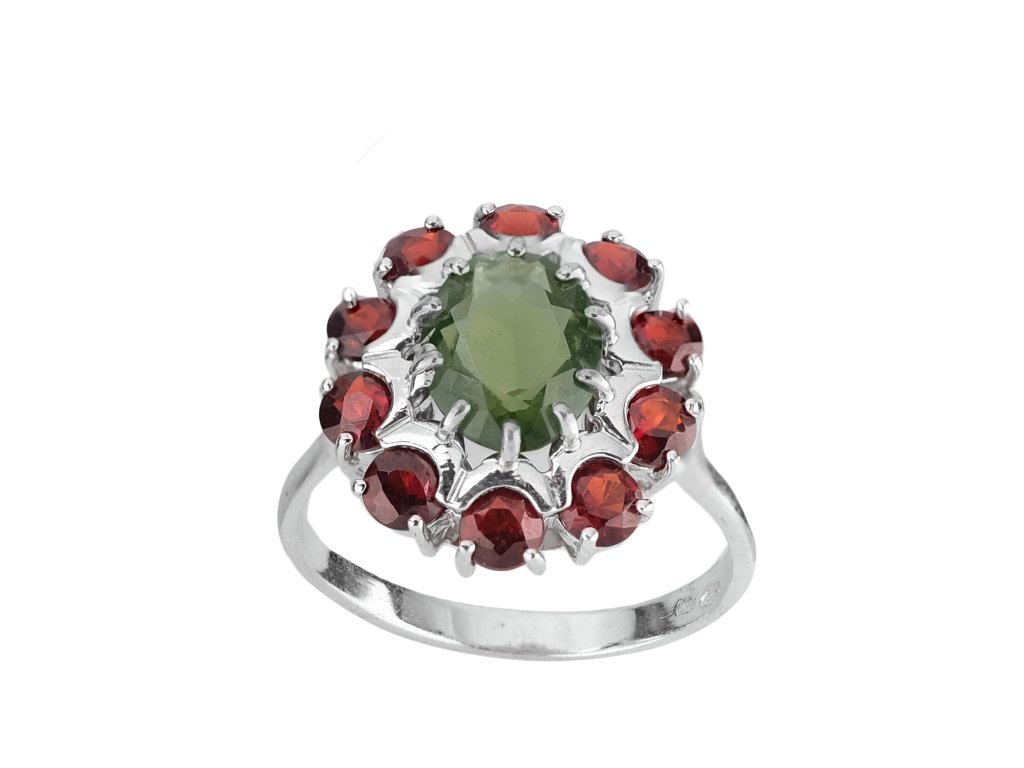 Krásný prsten z rhodiovaného stříbra osázen 10ks červeného Granátu v briliantovém výbrusu s Vltavínem v oválném výbrusu o velikosti 7x9mm. Celková hmotnost je 3,266g. Luxusní šperk s českou tradicí, který zaujme všechny milovnice vzácných kamenů. Ke každému šperku dostanete podepsaný certifikát pravosti kamene.