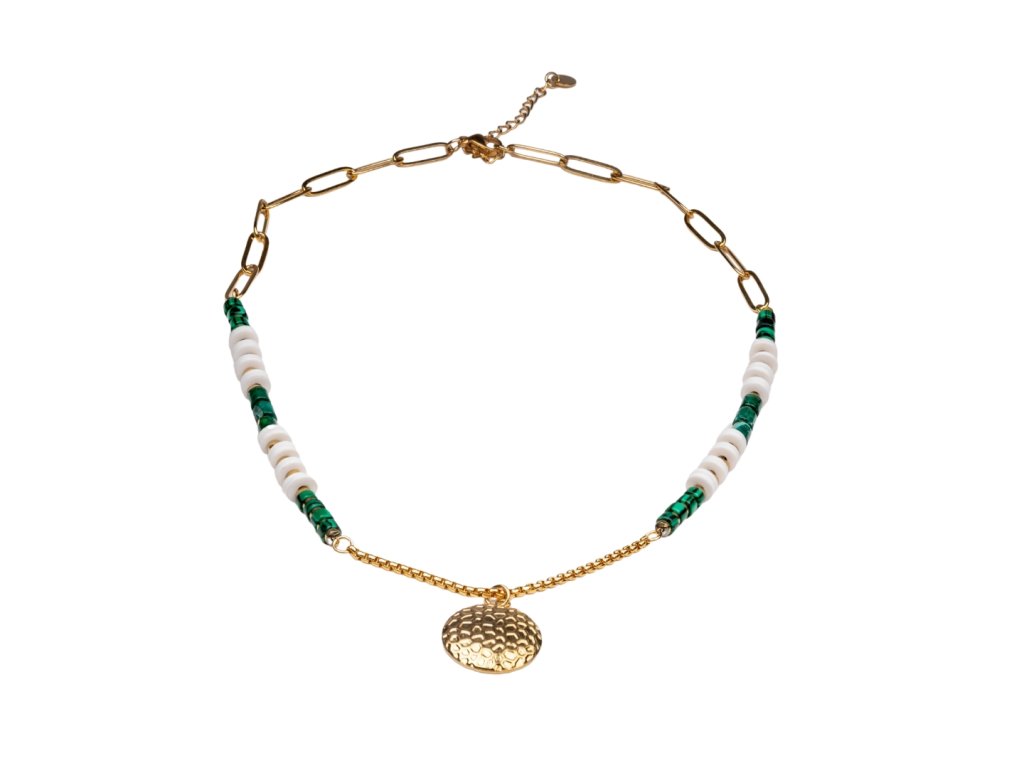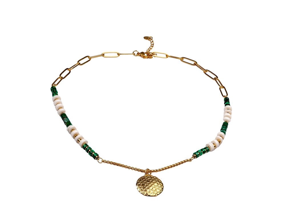 Trendy náhrdelník z pozlacené oceli s medailonkem a malachitem