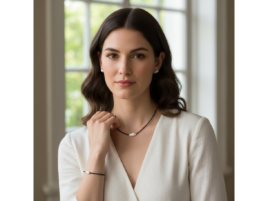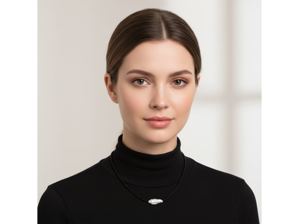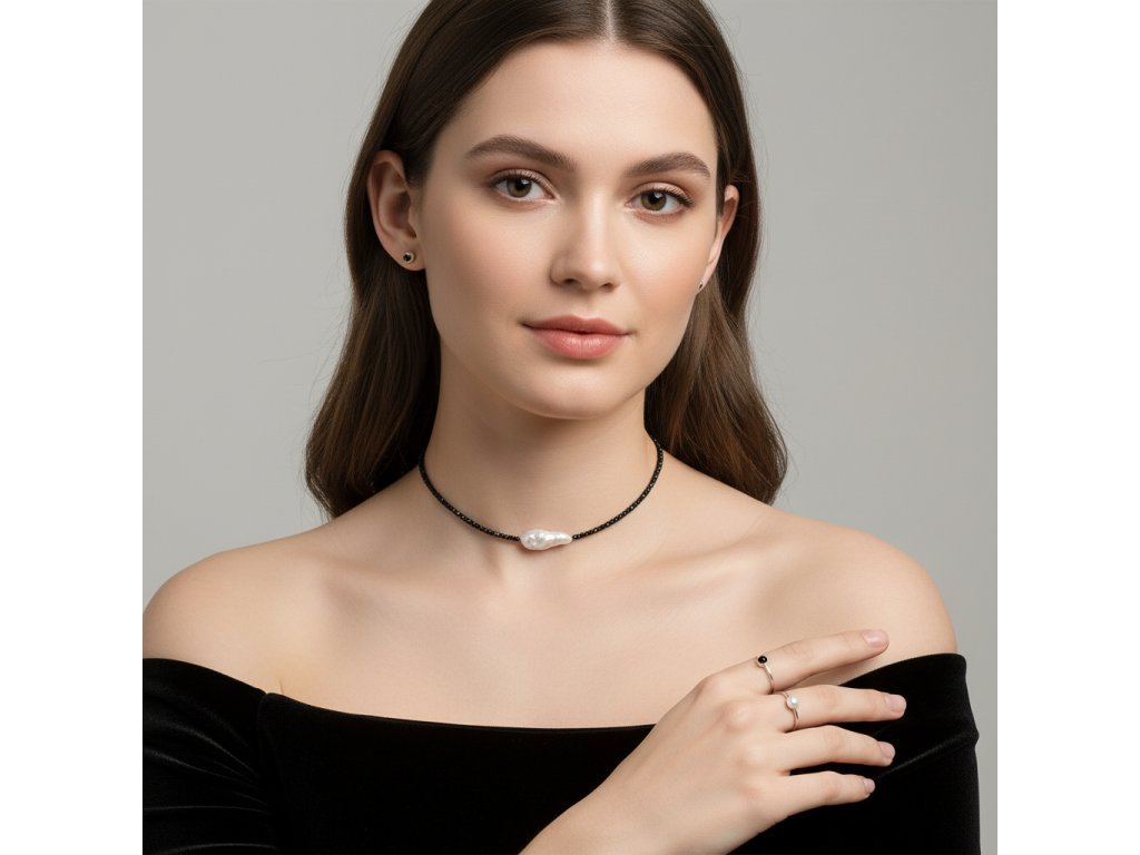 Trendy náhrdelník ze spinelových kamenů s dominantní Biwa perlou je dokonalým šperkem pro každou ženu, která touží po eleganci a stylu. Spinelové kameny přinášejí náhrdelníku sofistikovaný a moderní vzhled díky svému zářivému černému lesku. Tyto kameny jsou známé svou tvrdostí a intenzivní barvou, což zaručuje, že šperk bude dlouho vypadat jako nový a zachová si svůj půvab.