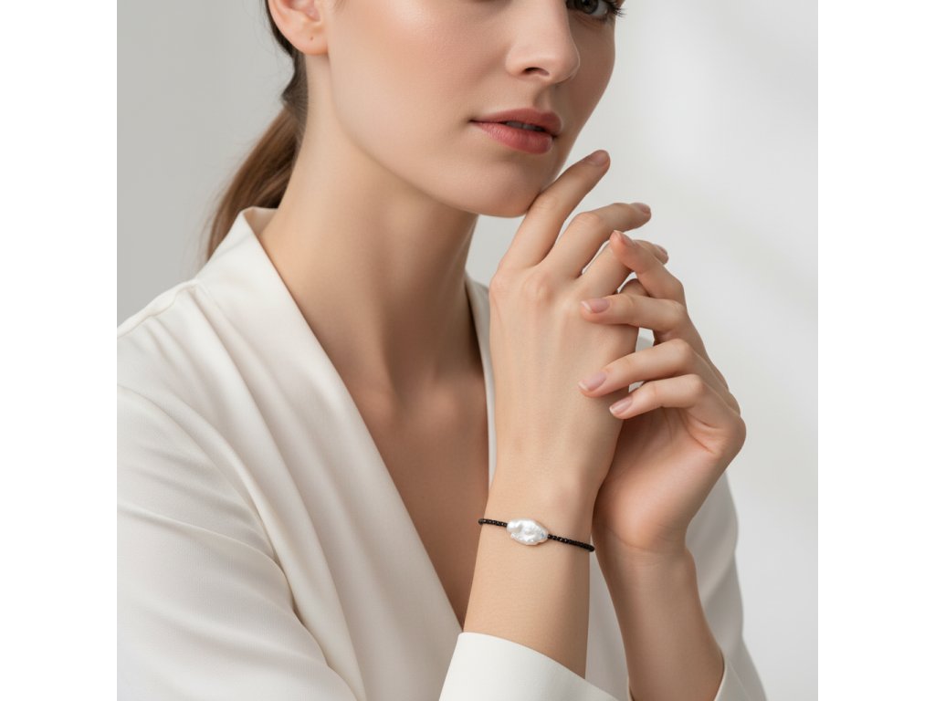Biwa perla, která je středobodem tohoto náramku, přitahuje pozornost svou jedinečnou krásou a kvalitou. Pravé Biwa perly jsou známé svým přirozeným leskem a unikátními tvary, což dodává každému šperku osobitý charakter a exkluzivní vzhled. Tato perla se stává dominantním prvkem náramku, který zaujme na první pohled a dodává šperku punc luxusu a elegance.
