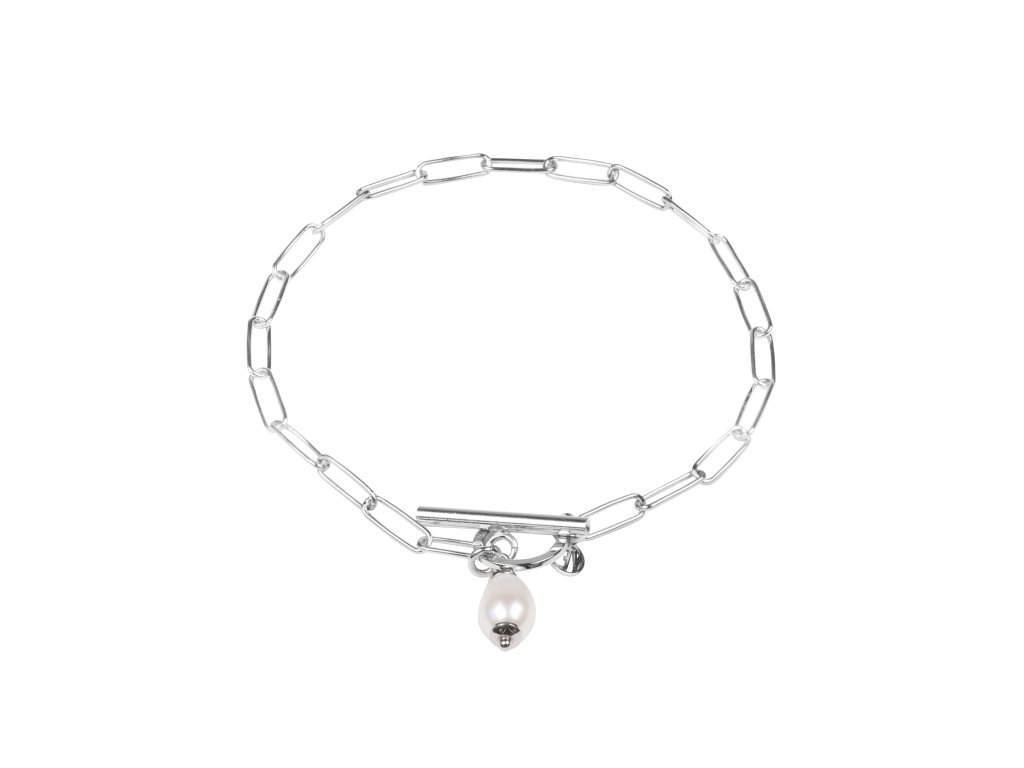 Elegantní náramek z rhodiovaného stříbra v moderním designu je ozdoben pravou bílou rice perlou, která svým jemným leskem dodává šperku jedinečný charakter. Rhodiování chrání stříbro před zčernáním a zajišťuje jeho dlouhotrvající krásu i odolnost při každodenním nošení.