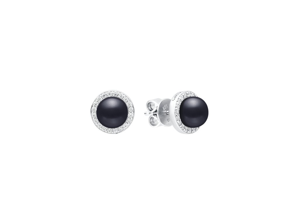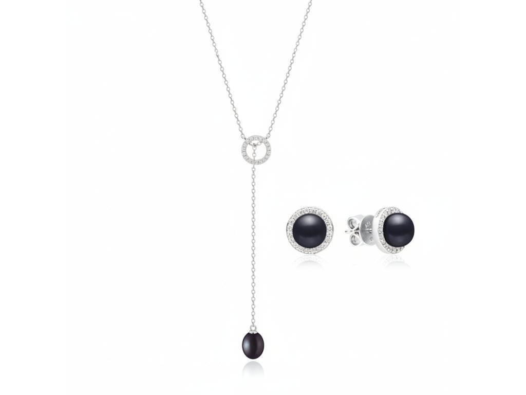 Trendy stříbrný set šperků s pravými černými perlami a třpytivými zirkony