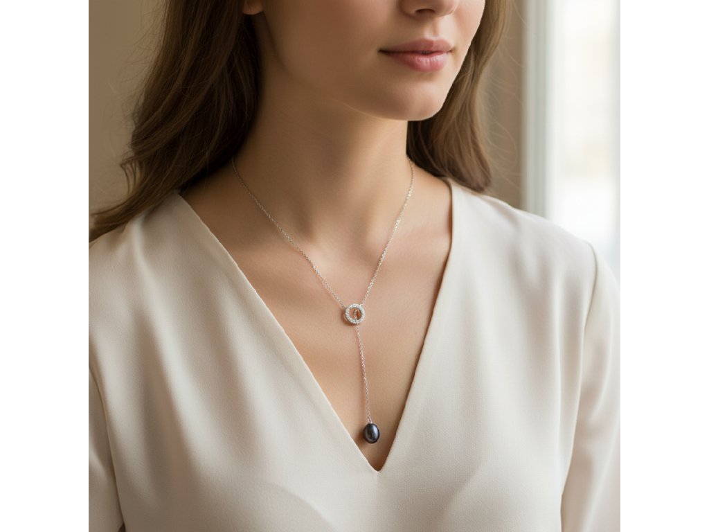 Kruhový závěs zdobený zirkony dodává přívěsku jiskru a luxusní nádech, zatímco rhodiované stříbro zajišťuje, že přívěsek zůstane moderní a odolný vůči poškrábání a ztrátě lesku. Originální řešení závěsu umožňuje, aby perla elegantně spočívala v dekoltu, čímž přitahuje pozornost a podtrhuje ženskou krásu.