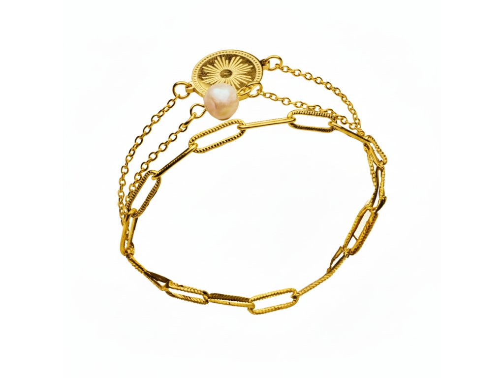Trojřadý dámský náramek z pozlacené oceli je elegantním doplňkem, který zaujme svým luxusním designem. Skládá se z jemného řetízku zdobeného medailonkem, řetízku se vzorem Anker s velkými oky a jemného řetízku se sladkovodní bílou perlou. Náramek má variabilní délku 16 - 21 cm, což umožňuje snadné přizpůsobení na zápěstí. Je pozlacený 18kt zlatem speciální technikou IP, která je hypoalergenní, odolná vůči tělesnému potu, parfému a poškrábání. Tento náramek je ideální volbou pro každodenní nošení a skvěle doplní outfit každé ženy.